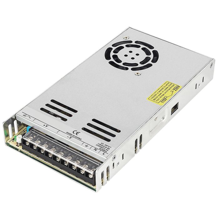 Entrata di rete selezionabile da interruttore con raffreddamento ad aria forzata da ventola DC, led di indicazione di accensione e potenziometro per regolazione della tensione di uscita.