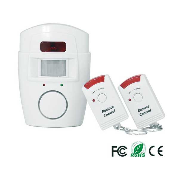 Allarme con sensore PIR con sirena integrata da 105 db di potenza, staffa di fissaggio a parete e 2 telecomandi IR. Attivabile e disattivabile tramite il telecomando ad infrarossi, è indicato per proteggere appartamenti, garage, roulotte o barche. Puo essere installato a parete, tramite l’apposita staffa (regolabile) oppure appoggiato su un ripiano. Alimentazione Allarme PIR: 4 batterie da 1,5 volt tipo AA (non incluse) oppure tramite alimentatore da rete a 6 Vdc (non incluso), alimentazione telecomandi IR: 3 batterie a bottone LR44 (incluse). Dimensioni Allarme PIR (mm): 122x86x50, dimensioni telecomandi (mm): 60x35x16.