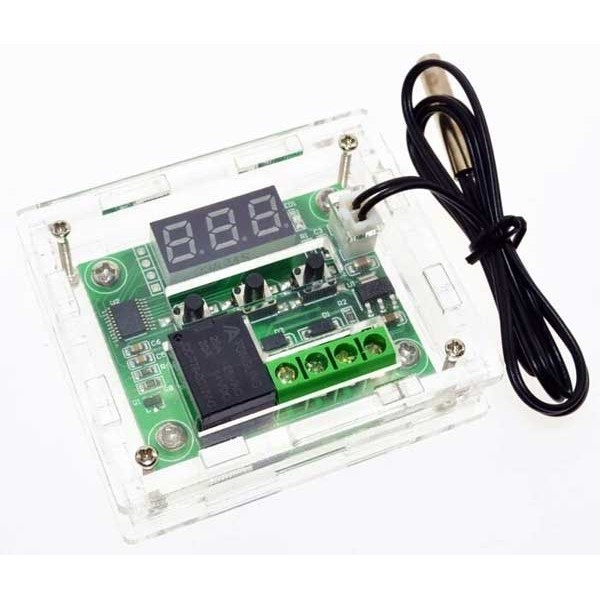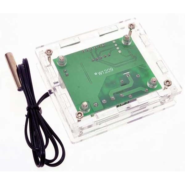 Contenitore plastico trasparente appositamente realizzato e forato per ospitare il minitermostato (codice 2846-MINITERMOSTATO). È composto da due pannellini laterali, una parte inferiore e una superiore, una frontale e una posteriore. Si assembla semplicemente incastrando le varie parti e utilizzando 4 viti e 4 dadi per bloccare tutto. Dimensioni esterne (mm): 60 (lunghezza) x 51 (larghezza) x 16 (altezza) mm, dimensioni interne (mm): 50 (lunghezza) x 42 (larghezza) x 11 (altezza). La confezione comprende anche 4 viti, 4 dadi e 4 distanziali per fissare il minitermostato al contenitore.