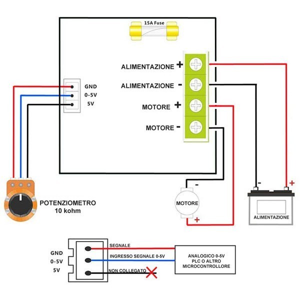| Compatta scheda che permette di regolare la velocità di un motore DC, con alimentazione compresa tra 6 V e 90 V e una corrente massima di 15 A, tramite un potenziometro. Dispone di morsettiera a vite per alimentazione e motore, fusibile di protezione da 15 A, potenziometro completo di manopola. Dimensioni (mm): 64x59x22. |