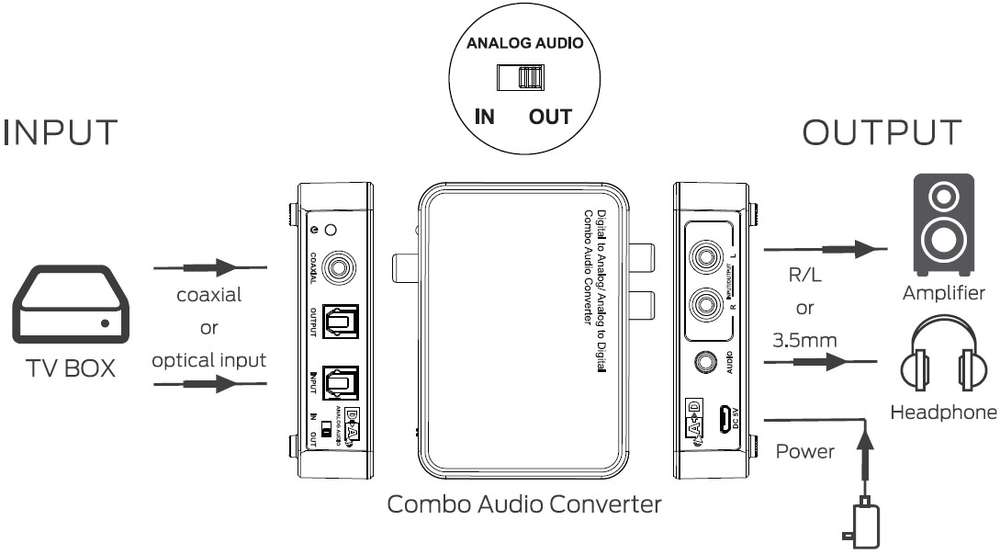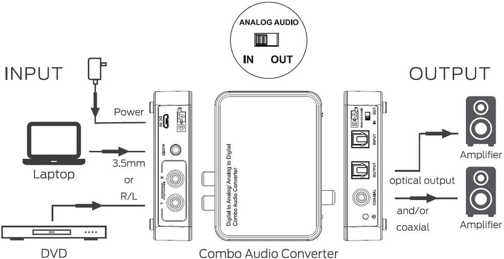 Questo convertitore audio combinato digitale ad analogico/analogico a digitale è un convertitore progettato per la commutazione audio domestica o professionale. Converte l'ingresso audio digitale coassiale o ottico in uscita stereo analogica su RCA o 3,5 mm e può anche convertire segnali audio analogici in audio digitale segnali, può convertire in entrambe le direzioni.
