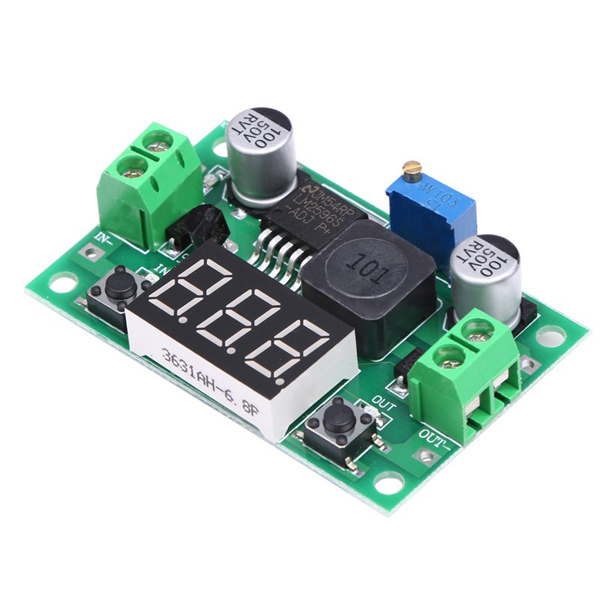 Convertitore DC/DC step down con Voltmetro. Permette di convertire una tensione continua in ingresso compresa tra 4 e 40 volt in una tensione di uscita da 1,25 a 37 volt (regolabile tramite trimmer). Dispone di due LED di stato (ingresso e uscita), due pulsanti che servono per attivare la visualizzazione della tensione di ingresso o di uscita e per accendere/spegnere il display. La massima corrente disponibile è di circa 2 A. |