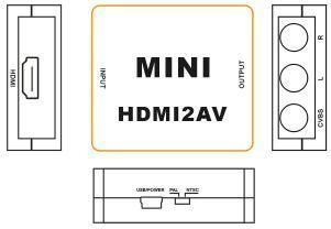 Il convertitore di segnale da MINI HDMI a AV che converte il segnale video HDM o il segnale audio in segnale video composito AV (CVBS) e i segnali audio stereo FL / FR, mentre supporta i segnali sideline del sistema DVI. Per aiutare gli utenti a convertire l'alta qualità del segnale video HDMI in un normale segnale CVBS (480i, 576i, definizione standard). In questo modo è possibile riprodurre su TV, VHS VCR, registratori DVD, ecc. E supportare due formati TV NTSC e PAL.