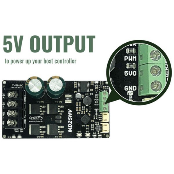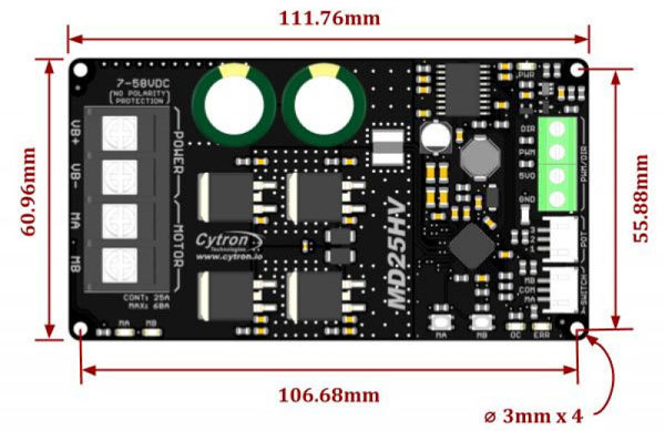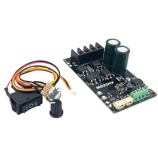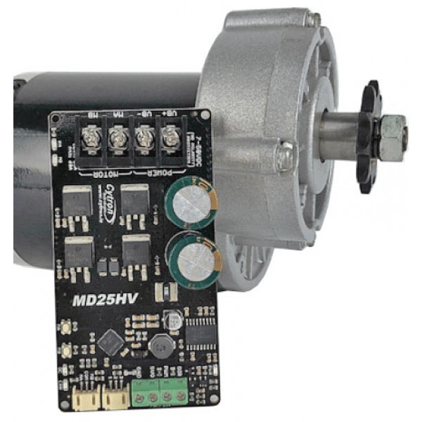 L’MD25HV è un driver di potenza con controllo bidirezionale per 1 motore DC con alimentazione compresa tra 7 VDC e 58 VDC. È in grado di supportare una corrente di 25 A in modo continuo senza l’utilizzo di un dissipatore di calore aggiuntivo. Dispone di una morsettiera per il collegamento dei motori e per l’alimentazione, uscita a 5 VDC (max 250 mA) per alimentare un controller esterno o altro dispositivo, due pulsanti di test che consentono di testare il motore in modo rapido e conveniente senza dover collegare un controller, ingressi per il controllo esterno (PWM e DIR) e LED di stato per Alimentazione, Errore, stato di Marcia.