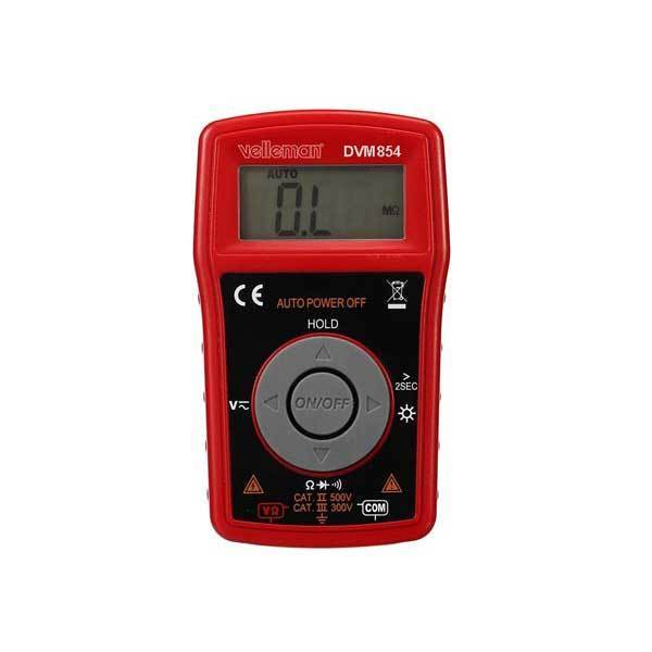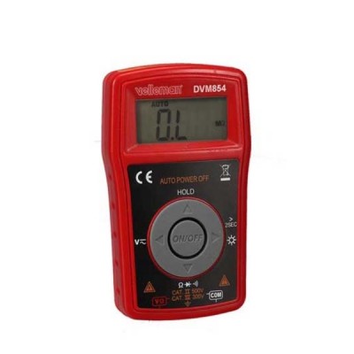 Multimetro digitale con rilevazione automatica delle portate, CAT. III 300 V / CAT. II 500 V, con display LCD a 3 cifre 1/2 retroilluminato in grado di misurare correnti continue fino a 10 A, tensioni continue e alternate fino a 500 V, resistenze fino a 20 Mohm, diodi, transistor e continuità elettrica. Dispone di riconoscimento automatico della polarità e indicazione di batteria scarica. Alimentazione con batterie tipo AAA (incluse). Viene fornito completo di guscio di protezione e di puntali CAT III 600 V – 12 A. |