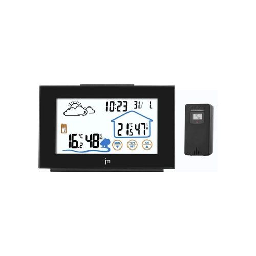 M JD-9522. Sveglia digitale radiocontrollata con indicazione delle condizioni meteo tramite apposite icone. Visualizzazione della temperatura ed umidità interne ed esterne tramite apposito sensore in dotazione. Visualizzazione dei valori massimi e minimi di temperatura ed umidità rilevati. Indicazione di comfort ambientale. Luce elettroluminescente a spegnimento ritardato. Calendario (giorno/mese/anno). Comandi touch.