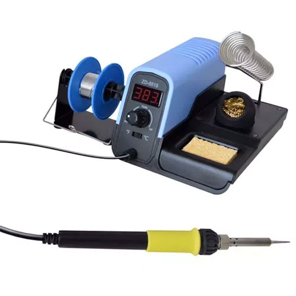 La confezione comprende: la stazione saldante con portasaldatore, un rotolo di stagno senza piombo da 1 mm (lungo circa 2 metri), un porta stagno, una paglietta in metallo e una spugna per la pulizia della punta.