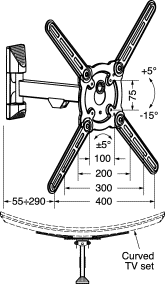 Con due snodi ruotabili in orizzontale di +/-90° e inclinabile in verticale di +/-15°. Adatto anche per monitor curvi.