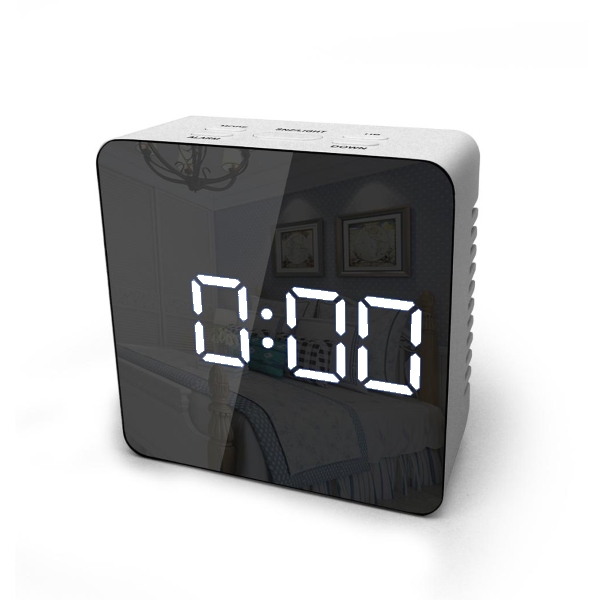 | Sveglia digitale a specchio con display a led bianchi. Dotata di allarme sonoro, visualizzazione temperatura ambiente e impostazione luminosità display. Alimentazione a batterie 3 x AAA o con alimentatore opzionale esterno, tramite cavetto USB ( incluso nella confezione). |