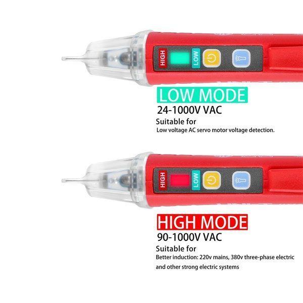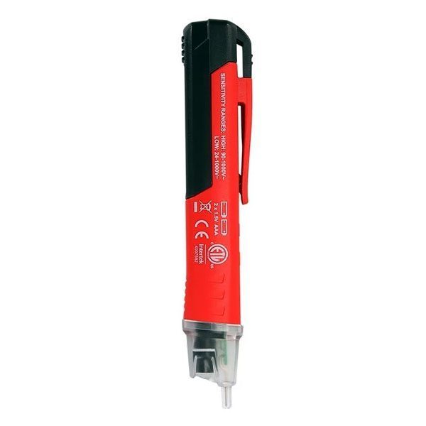 Tester a penna in grado di rilevare, senza contatto, tensioni AC comprese tra 90 e 1.000 volt e tra 24 e 1.000 volt. Molto utile per gli elettricisti, è particolarmente indicata nella manutenzione di apparecchiature a bassa tensione, fili, cavi, prese e altre apparecchiature elettriche/elettroniche. Dispone di segnalazione acustica (cicalino) e visiva (LED), torcia a LED, spegnimento automatico, indicazione di batteria scarica, alimentazione con 2 pile ministilo da 1,5 volt tipo AAA (non comprese). Basta posizionare la punta del sensore vicino al dispositivo da testare o in una presa AC, quando viene rilevata la tensione AC, il LED rosso sulla punta si accende e il cicalino suona. La frequenza del cicalino e i LED di rilevamento aumentano quando il rilevatore si avvicina all’oggetto.