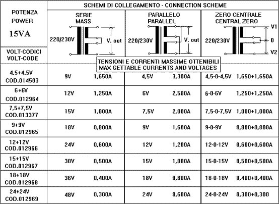 Trasformatori di alimentazione per elettronica. Primario 220Vac. Due secondari uguali che si possono collegare in serie od in parallelo. In serie si raddoppia la tensione con la possibilità di avere anche lo zero centrale, (es. 12-0-12V). In questo caso il trasformatore fornisce la corrente di un avvolgimento. Nel collegamento in parallelo si raddoppia la corrente e rimane invariata la tensione.