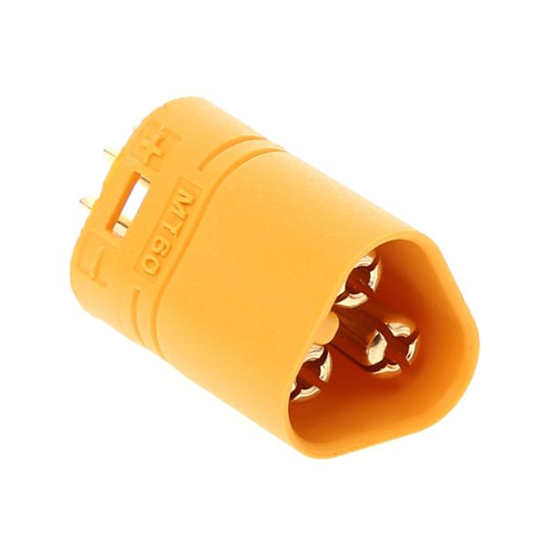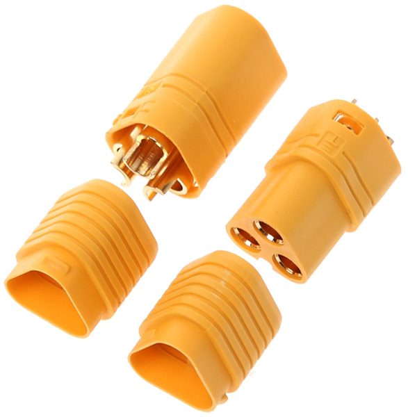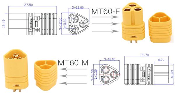 Confezione composta da un connettore maschio e un connettore femmina a 3 poli MT60. Utilizzato solitamente per collegare un ESC al motore Brushless, è adatto per fili con sezione 12AWG (circa 3,3 mm²), sopporta una corrente nominale di 60 A e una tensione nominale di 500 VDC. Temperatura di funzionamento: da -20°C a +120°C, classe di infiammabilità UL94V-0.