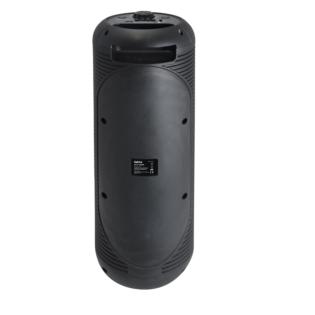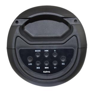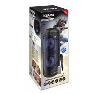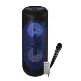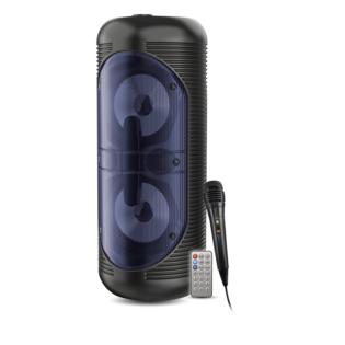 Diffusore amplificato con doppio woofer ideato sia per l'ascolto di musica sia per dilettarsi nel Karaoke in compagnia. Il look è estremamente originale e presenta dettagli esclusivi quali la griglia colorata e l'illuminazione dei woofer a ricreare un clima di festa. Ideale per ascoltare musica dal cellulare tramite bluetooth e pratico da trasportare grazie al suo peso ridotto. E' alimentato da una potente batteria litio da 2400mAh che garantisce ore di funzionamento. In dotazione viene dato sia un telecomando che un microfono a filo per l'uso immediato. Si ricarica tramite presa USB(cavo incluso).