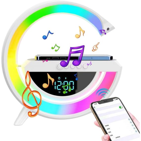 Lampada LED RGB Orologio/Radio FM/Bluetooth/AUX/scheda SD e ricarica wireless