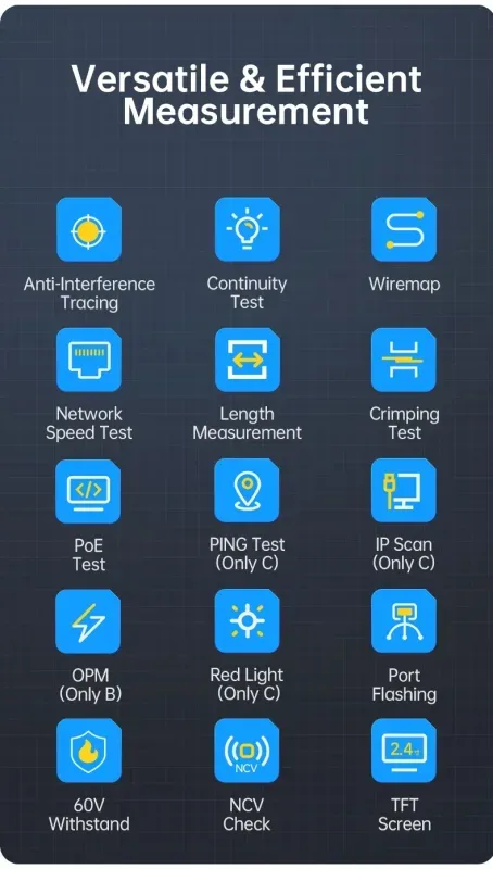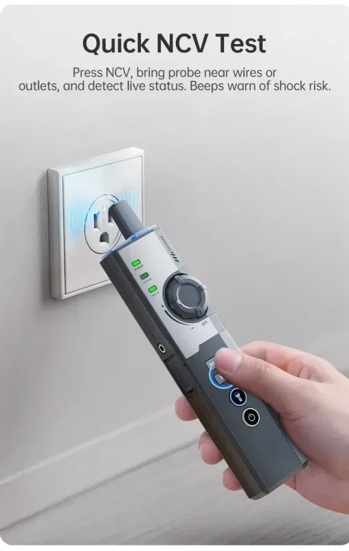 La funzione di misurazione della lunghezza del cavo aiuta a verificare la qualità della posa, individuare interruzioni e rispettare gli standard di installazione. Il test per cavi RJ45/RJ11 consente di diagnosticare errori comuni come fili non collegati, inversioni o cortocircuiti, garantendo cablaggi Cat5e/Cat6 affidabili. A tutto questo si aggiunge la sicurezza del sensore NCV, utile per riconoscere la presenza di cavi sotto tensione senza contatto diretto.