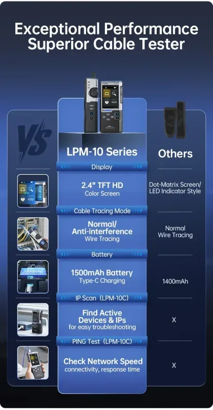 L’alimentazione tramite batteria integrata da 1500 mAh, ricaricabile tramite USB-C, assicura una buona autonomia durante il lavoro sul campo. Il design resistente e facile da trasportare lo rende ideale per interventi rapidi, attività su impianti PoE, videosorveglianza, reti LAN e telefonia. Il LPM10A è una soluzione completa, moderna e intuitiva, pensata per chi cerca uno strumento affidabile che semplifichi le operazioni di verifica e diagnosi nel mondo del networking.