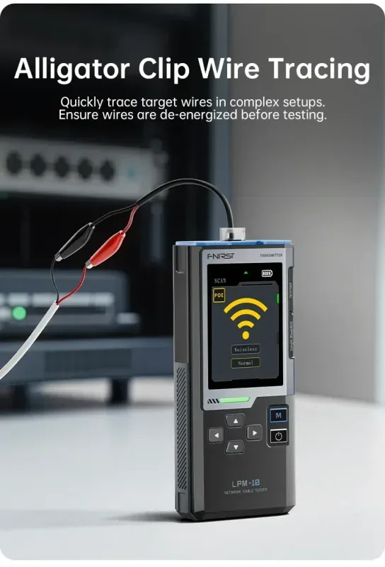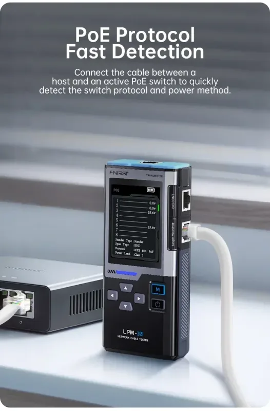 Il display TFT a colori da 2,4" garantisce una visualizzazione chiara delle informazioni: dallo schema dei fili alle error detection, fino ai parametri PoE relativi a standard, polarità e tensioni rilevate. Le due modalità di tracciamento — standard e anti-interferenza — permettono di individuare rapidamente il cavo corretto anche in ambienti complessi, come canaline affollate, quadri di rete o impianti con molte linee parallele. La sonda dedicata facilita la localizzazione del percorso del cavo, rendendo più rapido l’intervento.